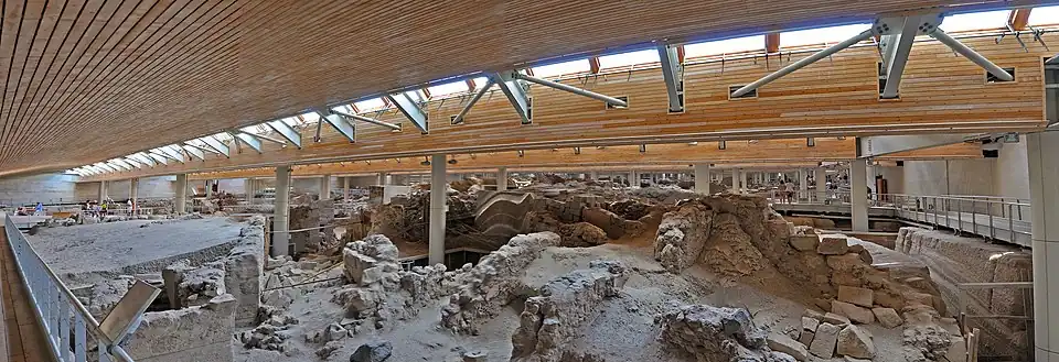 The Akrotiri excavation site is of a Cycladic cultural settlement on the island of Santorini, associated with the Minoan civilization due to inscriptions in Linear A, and close similarities in artifact and fresco styles.[4] The excavation is named for a modern village situated on a hill nearby. The name of the site in antiquity is unknown.