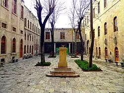During the 19th century, the Khan was possessed by the Franciscan Missionaries of Mary, where they founded the first college in Aleppo, the "Collège de Terre-Sainte" (The Holy Land College Arabic: معهد الأرض المقدّسة) along with a nearby church.[1] The rehabilitation works of the building began in 1853 and the college was opened in 1859. However, the construction of the whole complex was completed in 1879. The college has played a significant role in the educational and cultural life of Aleppo and Syria, with the graduation of many prominent politicians and writers within the end of the 19th century and the beginning of the 20th century.