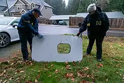 The cabin door plug was discovered in the backyard of a home in the Cedar Mill area, near Oregon Route 217.[33][34] It was reported to the NTSB on January 7.[35] Two mobile phones from the flight had also been found by members of the public, one in a backyard and the other by a road.[36]