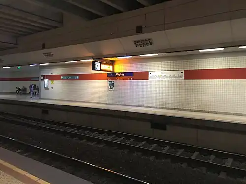 Alaybey railway station is a railway station on the İZBAN commuter rail system in İzmir. Alaybey is one of the four underground stations in the entire İZBAN line. The original station was built in 2001 and was served by the Basmane-Aliağa Regional Line and the Alsancak-Çiğli Commuter Line. The station was closed in 2006 and moved underground as part of the Karşıyaka tunnel. Alaybey was reopened on December 5, 2010.