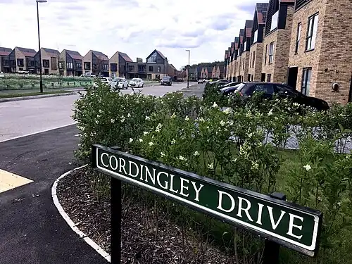 A new street in Pease Pottage was named after Albert Cordingley in 2020, 75 years after his death. Cordingley Drive forms part of a large new development called Woodgate[139] of over 600 homes, parkland, and a school at Pease Pottage that was originally approved in 2017 by Mid Sussex District Council.[140] The drive – surely an appropriate name for a street named after a cricketer, even if Albert Cordingley was primarily a bowler – runs from the new village green to the south-east boundary of the development, on land that was formerly Hardriding Farm, Brighton Road, Pease Pottage.[103][141]
