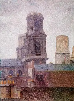 The churches and landscapes of the surrounding Auvergne region are the subject matter of his final paintings.[5] He died in Le Puy-en-Velay on 18 August 1890[4] at the age of 43 during an outbreak of smallpox.[5] The following year, a memorial exhibition, organized by Signac and consisting of sixty-four of Dubois-Pillet's paintings, was mounted by Les Indépendants.[12][13] Because of a fire which destroyed the majority of his work, as well as his rather early death, his extant oeuvre is relatively small.[1][3]