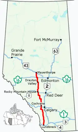 Immediately after leaving Cochrane Highway 22 passes the Hamlet of Cochrane Lake and then an important intersection with Highway 567. From there it continues north to the Village of Cremona and then meets Highway 27 at another T intersection.[3] After jogging west it reaches Sundre where it once again turns north to Caroline. After another short westward jog the highway crosses the Red Deer River and heads north to Rocky Mountain House where it runs a short concurrency with Highway 11. From there it continues north to Highway 39 where it jogs west for the fourth time crossing the North Saskatchewan River and reaching Drayton Valley. It continues north from Drayton Valley and reaches Highway 16 (Yellowhead Highway) at Entwistle approximately 85 km (53 mi) west of Edmonton.[4] After a 8 km (5 mi) westbound concurrency with Highway 16, it continues north to cross Highway 43 in Mayerthorpe and ends 7 km (4 mi) north of the town at Highway 18.[4]