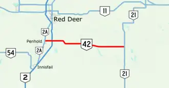 Alberta Provincial Highway No. 42, commonly referred to as Highway 42, is a 44-kilometre (27 mi) highway in central Alberta, Canada that connects Highway 2A in Penhold, about 9 kilometres (6 mi) south of the city of Red Deer, to Highway 21 near the Hamlet of Lousana.[2][1]