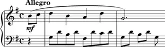 The first two bars of Mozart's Piano Sonata in C major K. 545... The passage consists of an Alberti-bass accompaniment supporting...[a] melody.