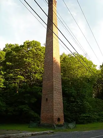 The history of Alcove is a history of the mills established along the Hannacroix (Haanacrois) Creek. In 1790, an early settler by the name of Casperus Ackerman established the first mill in the area.[2] In 1844, Ephraim Andrews established the Valley Mill for carding of wool and cloth manufacturing along the Hannacroix Creek at the corners of what is now New York State Route 143 and Albany County Route 111.[2][3] It would be expanded in 1848 and converted to the manufacturing of straw paper by John E. Andrews, and in 1854, in partnership with WS Briggs, improvements such as steam power were introduced. WS Briggs and Sons was formed as a partnership in control of the mills in 1871, with Briggs' son Amos D. Briggs as proprietor. This partnership would buy other local mills as well, including Ephraim Andrews'. An early name for Alcove was Stephensville, named for Archibald Stephens, who at one time owned the Andrews' mill prior to selling it to WS Briggs and Sons. When the post office was established in the hamlet in 1881, it took the name Alcove.[2] The Valley Mill was destroyed by fire in 1892 leaving the 110-foot-tall (34 m) chimney as the only remnant. The chimney is on the National Register of Historic Places and, along with 140 acres (0.57 km2) of the hamlet, is a part of the Alcove Historic District. The district was created in 1980 and has eight contributing properties. The Alcove Preservation Association has been attempting to restore the chimney with hopes of creating a pocket park and interpretive historical center.[3]