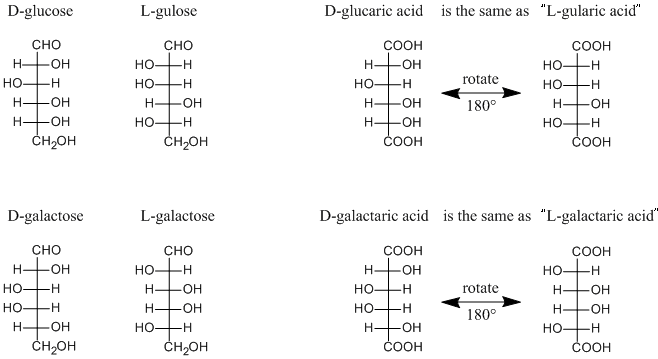 Unlike their parent sugars, aldaric acids have the same functional group at both ends of their carbon chain; therefore, two different sugars can yield the same aldaric acid (this can be understood by looking at the Fischer projection of a sugar upside down—with normal aldoses, this is a different compound due to the aldehyde function at the top and the hydroxyl function at the bottom, but with aldaric acids, there is a carboxylic acid function on both ends, so upside down and right side up do not matter). For example, D-glucaric acid and L-gularic acid are the same compound (but the first name is preferred, because of D- prefix). A consequence of this is that some aldaric acids are meso forms with no optical activity despite their multiple chiral centers—this occurs if a sugar and its enantiomer oxidize to the same aldaric acid. An example is D-galactose—it has four chiral centers, but D-galactaric and L-galactaric acids, which have the opposite configuration at each chiral center and therefore would be expected to be enantiomers, are actually the same compound; therefore, galactaric acid is an achiral meso form with no optical activity. Again, this can be understood by taking the Fischer projection of either acid and looking at it upside down—the configuration is now switched at every carbon.