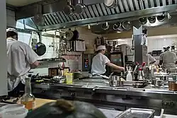 The restaurant occupied two stories and had an open kitchen [2] so that diners could observe the preparation of food.[3] It was decorated in a minimalist style with birch trees in its interior.[4] Adam Platt of New York described the interior in 2009 as a "double-height, blond-wood-paneled space is set with chairs covered in plush white and blue leather, and a façade of white-striped glass filters the view of the outside world. The room is luminously lit and partitioned with sheets of more glass, which make it feel intimate and also worldly".[3]