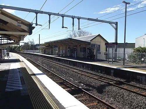 It opened on 5 February 1899 at the same time as the line.[1][2] A shelter for passengers was built on the outbound side in 1897, which has since been demolished.[2] In 1921 a duplication of the track occurred.[2] The shelter shed on the outbound platform was built in 1926, while the station building on the inbound platform was constructed circa 1950-52.[2] The station has been a Local Heritage Place since January 2004, due to It contributing to the development of the suburb, while providing the provision of railway services to the local area in the early to mid-20th century.[2][3] In 2017, the station received many upgrades.[4][5][6][7][8][9] In 2020, deterioration forced the closure of the timber bridge over the rail line at Frederick Street in Alderley.[10]