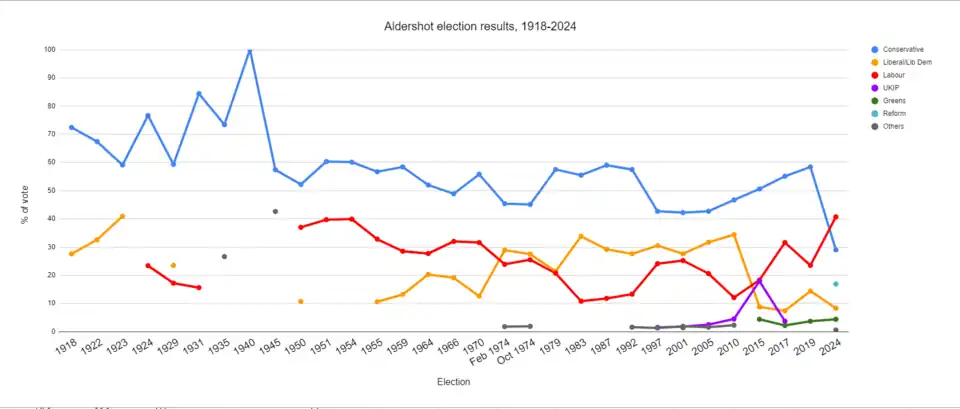Aldershot elected a Conservative as its MP at every election from its creation in 1918 until the 2024 general election, which was won by Labour.