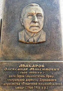 Oleksandr Maksymovych Makarov (Ukrainian: Олександр Максимович Макаров; September 12, 1906 – October 9, 1999) was a Soviet and Ukrainian rocket engineer and General Director of PA Pivdenmash from 1961 to 1986, Laureate of Lenin and State Awards, twice Hero of Socialist Labour, Honored Mechanical Engineer of the Ukrainian SSR, holder of the Order of Prince Yaroslav the Wise, and Honorary Citizen of Dnepropetrovsk.