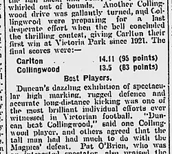 - ^ Brownlow Medal: Won by S. Coventry, The Argus, (15 September 1927), p. 5. In the only match that Carlton played against Collingwood that year (round nine), Duncan was far, far better than anyone else on the ground, including Coventry (it was "Duncan's match").