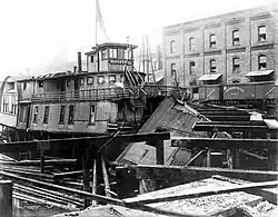 By November 1901, the steamer Idaho was in a critical condition and in need of overhaul. The City Council gave the Wayside Mission permission to build a gridiron at the foot of Jackson street and put the ship on it.[64] But during a severe storm in January 1902, the Idaho broke from its mooring with patients and staff on board. As it was tossed by the waves, its stern was severely damaged by logs that were anchored nearby. People were evacuated from the ship by the city's fire department, and crews of nearby anchored vessels helped to save the boat from sinking, securing it near the wharf.[65] The ship survived the storm and proceeded to be re-moored at its original position.[60][55][66]