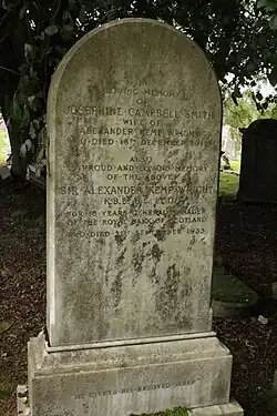 He died suddenly in Edinburgh on the afternoon of Thursday 21 September 1933 whilst attending a funeral service of a friend in St Mary's Episcopal Cathedral. He had been working as usual in the bank that morning.[9] He is buried in Grange Cemetery in the south of Edinburgh. The grave lies in the south-west extension close to the west wall.