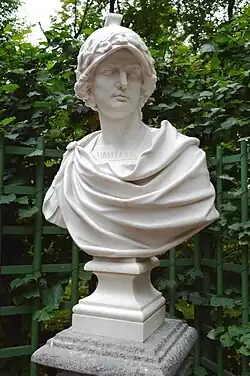 By 1870, a plethora of iconographic representations of Alexander the Great had emerged. In the context of European painting, he was typically depicted as a youthful, energetic warrior, clad in a helmet and a full suit of armour. To depict Alexander's face, Siemiradzki could have utilised a cast from a Roman copy of a statue of Alexander by Lysippos, held in the collection of the Academy of Arts, as well as an 18th-century marble bust located in the Summer Garden.[62]