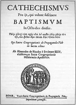 While in Vietnam, de Rhodes developed an early Vietnamese alphabet based on work by earlier Portuguese missionaries such as Gaspar do Amaral, António Barbosa and Francisco de Pina. De Rhodes compiled a catechism, "Catechismus pro ijs, qui volunt suscipere baptismum in octo dies divisis", and a trilingual dictionary and grammar, Dictionarium Annamiticum Lusitanum et Latinum. Both published in Rome in 1651, de Rhodes's works reflect his favor of this new Latin-script alphabet instead of Nôm script.[13] Later refined as chữ Quốc ngữ, it eventually became the de facto written form of Vietnamese language in the 20th century. Meanwhile, Maiorica's catechism and devotional texts reflect the favor of chữ Nôm, which was the dominant script of Vietnamese Christian literature until the 20th century.[14]