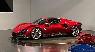 The Alfa Romeo 33 Stradale is a sports car manufactured by Italian automobile manufacturer Alfa Romeo. Unveiled on August 30, 2023, the car was made available with two powertrain options, either a 3.0-litre twin-turbocharged 690T V6 engine (which is a development of the engine from the Giulia Quadrifoglio) or an all-electric powertrain option.[5][4]