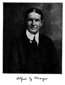 Mayor was born in Sunnyside, Frederick, Maryland, the son of Katherine Duckett (Goldsborough) and Alfred Marshall Mayer.[1] His mother died shortly after his birth and he grew up with his father and his step-mother Maria Snowden. His father became a professor of physics at Stevens Institute. He was of part German descent. An uncle Frank Blackwell Mayer was a French-trained artist. Another uncle Brantz Mayer was an archeologist.[2] Dropping out from school at age sixteen, he began to work in a machinist's shop. To please the request of his father, Alfred enrolled in the Stevens Institute of Technology and graduated ME in 1889. He worked with Professor Michaelson at Clark University for a year, then with Lucien Blake at the University of Kansas (1890–92) and then shifted to biology at Harvard University in 1892. He studied the colors and patterns of butterflies and moths under Edward L. Mark[3] and was encouraged by Alexander Agassiz at Newport. Agassiz also had him study marine organisms. Professor Blake stated that," [Alfred was] successful in Physics,...his true taste and longings were toward natural history." He accompanied Agassiz in 1892-93 on a cruise in the Bahamas and in 1896 he visited the Great Barrier Reef. In 1897, he graduated from Harvard University with a Sc.D.[4][5]