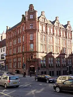 Waterhouse continued to practice in Manchester for 11 years, until moving his practice to London in 1865. At this stage of his career most of his commissions were either in the north-west or north-east of England. His earliest commissions were mainly for domestic buildings. Among Waterhouse's first commissions in 1854 were for his family: a set of stables at Sneyd Park, for his father, who had moved to Bristol, and alterations to the home of his uncle Roger Waterhouse at Mossley Bank in Liverpool.[11] In executing the commission for the cemetery buildings at Warrington Road, Ince in Makerfield (1855–56), he began his move towards designing public buildings in his developing Neo-Gothic style, building a lodge for the registrar, and two chapels, one Church of England in Gothic style, and one for Roman Catholic and Non-conformists in Norman style.[12] His first commission for a commercial building was for the now demolished Binyon & Fryer warehouse and sugar refinery in Chester Street, Manchester (1855). The building was of two floors made of brick with stone dressings and Italianate in style. The intended upper floors based on the Doge's Palace remained unbuilt.[13] Also he designed the Droylesden Institute (1858, demolished) in the Manchester suburb of Droylsden. It contained a reading room and other educational facilities and had some Gothic details. A similar building was the Bingley Mechanics' Institute built (1862–65), located in Bingley, with a hall and reading room in a Gothic style.[14]