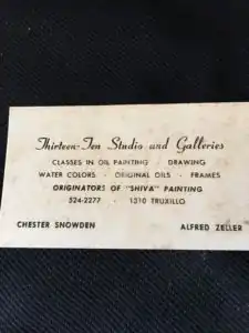 Since 1964, Alfred Zeller and Chester Snowden worked together in their Thirteen Ten Art Studio and Galleries, located at 1310 Truxillo Street in Houston, Texas. They offered classes in oil painting and claimed to be the "originators of the Shiva painting technique".[2] Alfred Zeller died in Houston, Texas at the age of 79.