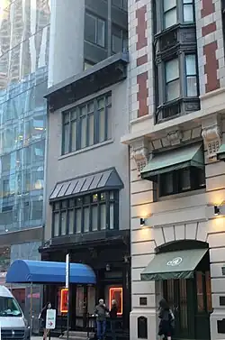 The adjacent block of 44th Street is known as Club Row and contains several clubhouses.[4] When the hotel was developed in 1902, the area was filled with clubhouses, including those of the Harvard Club, Yale Club, New York Yacht Club, New York City Bar Association, and Century Association.[5][6] Prior to the development of the Algonquin Hotel, the neighborhood contained a slaughterhouse, stables for stagecoach horses, and a train yard for the elevated Sixth Avenue Line. One of the stables became the Algonquin's three-story annex in 1904.[7] There had been many stagecoach stables on 43rd and 44th Streets between Fifth and Sixth Avenues,[8] but only a few of these buildings remained at the end of the 20th century.[7][8][a] By the 2010s, the hotel's annex was the only former stable on the block.[9] The Algonquin is also one of six hotels on 44th Street between Fifth and Sixth Avenues, the largest concentration of hotels on a single block in New York City during the early 21st century.[10]