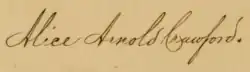 Alice Arnold Crawford (née, Arnold; February 10, 1850 – September 1874) was a 19th-century American author of poetry and short stories. She furnished articles in prose and verse for the leading publications of the day. After her death, an unedited collection of her writings, totaling almost two hundred pages, mostly in verse, was published in 1875 by Jansen, McClurg & Co., of Chicago.[1]
