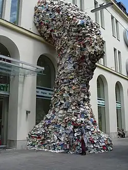 Her first sculpture of books was at the Casa de America in Madrid and the second was in Córdoba. This second sculpture was created in two parts and it took a team of eight people to construct it in place over 48 hours. It was essentially made from 5,000 donated books and was 5.5 metres high. The books appear to spout out of a window of the Molino de San Antonio as if they might fill the River Guadalquivir with their words.[5]