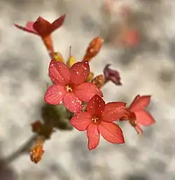 It blooms from May to July.[2]: 170 Clustering at the ends of the stems, reddish or carmine flowers have a 3⁄8 to 3⁄4 inch (0.95 to 1.91 cm) long corolla tube flaring to 5 lobes.[2]: 170