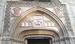 In the spandrels, two quadrilobed medallions appear that harbor shields with the insignia of the king of Aragon. In the resulting tympanum between the arches there is a band of interlocking mixtilineal blind arches, which refer to the series in the Banu Hud palace. This strip is interrupted by a box that houses a newly incorporated relief.