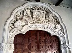 The main entrance to the Throne Room is highlighted by a trilobed recessed arch with a five-lobed tympanum, at the center of which is represented the coat of arms of the monarchy of the Catholic Monarchs, which includes the coats of arms of the kingdoms of Castile, León, Aragon, Sicily, and Granada, supported by two lieutenant lions. The rest of the decorative field is finished with delicate vegetal ornamentation, which reappears in the capitals of the jambs. The entire portal is made of hardened plaster, which is the predominant material in the interior of the Aljafería, as Mudéjar craftspeople perpetuated the materials and techniques that are common in Islam. In the same wall as the entranceway are two large windows with triple mixtilineal arches.
