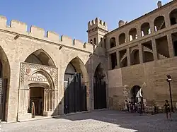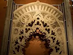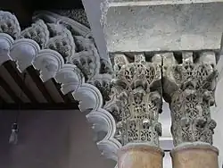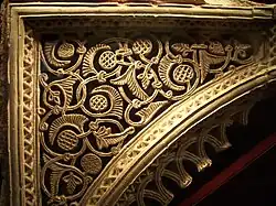 At the eastern end of the entrance portico to the Golden Hall is a small mosque or private oratory that would have been used by the monarch and his courtiers.[6] It is accessed through a portal that ends in a horseshoe arch inspired by the Mosque of Córdoba but with S-shaped springers, a novelty that imitated Almoravid and Nasrid art. This arch rests on two columns with capitals of very geometrical leaves, in the style of Granadan art using mocárabe. Its alfiz is profusely ornamented with vegetal decoration and on it is arranged a frieze of crossing half-point arcs.