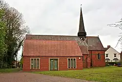 The church is built of red brick with stone dressings and tile roofs. It consists of a continuous nave and chancel, a south porch, and a north vestry. On the roof, at the division between the nave and the chancel, is a hexagonal shingled flèche, with a louvred bell stage and an iron weathervane. Inside is a 12th-century font brought from the old church.[2][4]