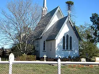 Reverend William Gore had visited Yandilla from time to time and conducted services during his visits. In 1860 he bought into the family firm and eventually became the major shareholder. The "village" at the station by then had over 100 inhabitants and a new church was built close to the homestead in 1863. It was described in the Darling Downs Gazette as:[1]