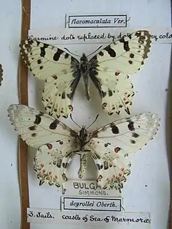 T. cerisyi God. (9d). Closely resembling in colour and pattern the male of Sericinus, being like this spotted with black on a pale yellow ground, the hindwing bearing traces of red near the middle of the costal margin and at the anal angle. Hindwing with only one strongly prominent tooth. Balcan States, Greece and Asia Minor; not so common as polyxena, occurring from April till early June, being still earlier in the southern districts. — The female varies very much ; specimens which are very strongly spotted with black are sold by dealers as ab. obscurior (9d), in albidior (9e) the ground-colour is white, in ochracea (9e) bright yellow, and in pallidior (9d) fallow; in ab. flavomaculata Verity the carmine dots are replaced by dots of honey-colour; all these aberrations occur together with ordinary cerisyi. — caucasica Led.[now species Allancastria caucasica (9e) has in both sexes very large, broad, black costal spots on the forewing, the hindwing being sUghtly and almost evenly scalloped, the middle tooth hardly projecting; in Armenia. — deyrollei Oberth.[ now species Allancastria deyrollei] (9d) has the three teeth before the anal angle of the hindwing prolonged into short tails; in the coast districts of the Black Sea, in the whole of Asia Minor, southward to Syria; extremely common, in some places appealing in enormous numbers. — cretica Reb. (9e) [now species Allancastria cretica] occurs on Crete and some Greek islands; a sparsely marked form in which the three teeth of the hindwing mentioned above are indicated only by black curved lines, the edge of the wing not being distinctly excised. Not so common as the preceding. — Larva yellow, brown or reddish, the tubercles being red; from May till July, on Aristolochia. Pupa dust-colour or yellowish grey, variegated with thin black dashes, especially on the head. — The buttertlies are on the wing on the first warm days of the year at rocky places and the edges of woods. [1]
