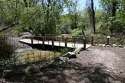 NYC Parks then began work on converting the park for public use. The northern section of the land became a nature preserve. In the southern section, a field house and numerous sports fields for soccer, baseball, tennis, and hockey were built.[12] These sections officially opened in 1935 with a ceremony attended by Mayor Fiorello H. La Guardia and Parks Commissioner Robert Moses. At opening, the park had 26 acres (11 ha) of new playing fields; the Alley Pond Park Nature Trail, the first of its kind in the city; a 23-acre (9.3 ha) bird sanctuary; bridle paths; tennis court; picnic areas; and a 200-space parking lot.[1] NYC Parks added a 2.5-mile (4.0 km) bicycle path in the 1930s, having acquired and converted Vanderbilt's parkway. It runs west into Cunningham Park as part of the 40-mile (64 km) Brooklyn-Queens Greenway from Bayside to Prospect Park and Coney Island.[1] The path opened in 1938.[13] Part of the southern section of Alley Pond Park was renovated into a nature trail and reopened in 1940.[14]