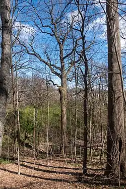 The Queens Giant (also known as the Alley Pond Giant or Alley Pond Park Giant), at 40°45′12″N 73°44′49″W / 40.75320°N 73.74708°W, is an old tulip poplar (Liriodendron tulipifera) that is located in Alley Pond Park.[56] It is the tallest carefully measured tree in New York City, measuring 133.8 feet (40.8 m) tall with a 19-foot (5.8 m) circumference as of 2004, and it might also be the oldest living thing in the New York metropolitan area, being between 350 and 450 years old in 2004.[57] A tree in Staten Island, known as the Clove Lake Colossus, has a more massive trunk, but it is only 119 feet (36 m) tall.[56] However, NYC Parks is unsure of the margin of error regarding the Queens Giant's age, and its true age may have a margin of error of several decades or centuries. Some arborists estimate the tree's age at 250 years, making it younger than other trees in the city.[58] The nearby Great White Oak in Douglaston, though smaller, may have been about 600 years old when it was cut down in 2009, though that tree's age is also disputed.[59]