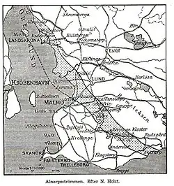 Alnarpsströmmen is a subterranean aquifer under the Swedish province of Scania. It has been used for wells since at least the 18th century and as a fresh water source for Malmö since 1901. Several other towns use it today.[1] Due to its artesian character, wells occasionally turn into fountains. About 400 litres of groundwater naturally flow into Öresund from Alnarpsströmmen every second through the quaternary moraine.[2] The width of the aquifer is around 20 km, and the flow of the water is just 10 metres a year.[3]