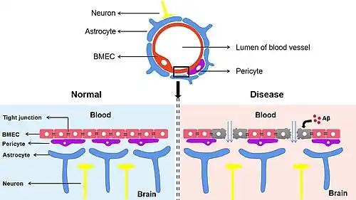 - ^ a b c Sweeney, Melanie D.; Sagare, Abhay P.; Zlokovic, Berislav V. (March 2018). "Blood–brain barrier breakdown in Alzheimer disease and other neurodegenerative disorders". Nature Reviews Neurology. 14 (3): 133–150. doi:10.1038/nrneurol.2017.188. ISSN 1759-4758. PMC 5829048. PMID 29377008.
