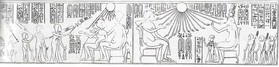 On the east wall Akhenaten is shown leading his mother Tiye to a temple. They are accompanied by the princess Baketaten as they enter the temple. Nefertiti and her daughters are not shown in this scene.