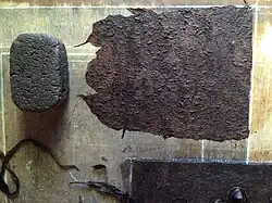 Little is known about the paper's manufacture in the pre-Hispanic period. Stone beaters dating from the 6th century CE have been found, and these tools are most often found where amate trees grow. Most are made of volcanic stone with some made of marble and granite. They are usually rectangular or circular with grooves on one or both sides to macerate the fibers. These beaters are still used by Otomi artisans, and almost all are volcanic, with an additional groove added on the side to help hold the stone. According to some early Spanish accounts, the bark was left overnight in water to soak, after which the finer inner fibers were separated from coarser outer fibers and pounded into flat sheets. But it is not known who did the work, or how the labor was divided.[18]