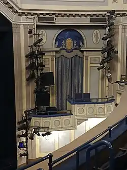 The balcony level is divided into front and rear sections by an aisle halfway across its depth. The walls of the balcony level are angled sideways to accommodate the theater's shape.[18] The side walls (near the boxes) are decorated in the Adam style, with fan shapes inside arches, which in turn are augmented by motifs such as swags.[18][19] The rear walls and the balcony's underside contain plasterwork paneling. The balcony's front rail contains Adam-style paneling and lights.[18] A smoking room and a mezzanine room adjoined the balcony level.[14]