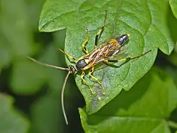 Amblyteles armatorius can reach a length of 12–16 mm, excluding antennae, which reach about 9 millimetres (0.35 in). The head and thorax of this large wasp are black, except the yellow scutellum. The abdomen is yellow and more oval in the females, with broad black bands. Legs are yellow, except the hind legs, that are black and yellow. This species lacks a sting, so the characteristic markings of many aculeate wasps represent a protective mimicry.[8] [9] The female has a very short ovipositor that doesn't protrude from the abdomen.[7]