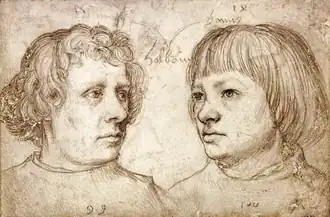 The young Holbein, alongside his brother and his father, is pictured in the left-hand panel of Holbein the Elder's 1504 altarpiece triptych the Basilica of St. Paul, which is displayed at the Staatsgalerie in Augsberg.[1]