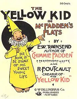 The G. W. Dillingham Company published the first known proto-comic-book magazine in the US, The Yellow Kid in McFadden's Flats, in 1897. A hardcover book, it reprinted material—primarily the October 18, 1896, to January 10, 1897, sequence titled "McFadden's Row of Flats"—from cartoonist Richard F. Outcault's newspaper comic strip Hogan's Alley, starring the Yellow Kid. The 196-page, square-bound, black-and-white publication, which also includes introductory text by E. W. Townsend, measured 5 by 7 inches (130 mm × 180 mm) and sold for 50 cents. The neologism "comic book" appears on the back cover.[12] Despite the publication of a series of related Hearst comics soon afterward,[12] the first monthly proto-comic book, Embee Distributing Company's Comic Monthly, did not appear until 1922. Produced in an 8+12-by-9-inch (220 mm × 230 mm) format, it reprinted black-and-white newspaper comic strips and lasted a year.[12][13]