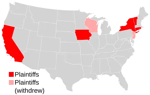 State plaintiffs in the case. New Jersey and Wisconsin, in light red, eventually withdrew. The Supreme Court held that state parties had standing following the precedent of Massachusetts v. Environmental Protection Agency.