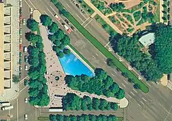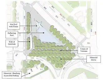 A revised design was submitted to the CFA as well as to the NCPC in June 2005.[86] In the revised design, the fountain was now a simple basin (without water jets) in the shape of a star, with the eternal flame at its center.[88] A thin scrim of water surrounded the flame, making it appear as if the fire were emerging from the water itself.[82] The northeastern sides and arms of the star spilled water over into a reflecting pool.[88] Extending northwest and southeast from the star-shaped basin was a triangular reflecting pool whose long edge bordered Washington Avenue. Both the star-shaped basin and the reflecting pool were intended to be of black granite.[88] Both the basin and the reflecting pool were designed to have as little rippling water as possible, so as best to reflect both the eternal flame and the Capitol building.[88] Trees lined the edges of the reflecting pool, except for an opening on the northeast portion of the site (which permitted views of the U.S. Capitol). The length of the stone and glass walls was now much reduced, and they were set near the trees on the western and southern edges of the site. The memorial's primary entrance was still considered to be on the north end, but stone walls came close together in the southwest corner of the site to create a major secondary entrance. The white marble-faced stone walls were called the "Walls of Loss", and Vergason intended for them to be inscribed with stories from disabled veterans documenting how they were wounded, their reactions to their disabilities, and the way they felt society treated them.[82] Circular openings in the stone walls helped maintain a sense of openness rather than being walled off.[83] The glass walls were called the "Walls of Light". Vergason intended for these walls to be more uplifting, and to be inscribed with quotes about democracy, honor, sacrifice service, duty, and patriotism. Nearly the entire site would be paved with grey granite, and grey granite benches would be placed in strategic locations to force visitors to the Capitol and fountain from the best angles. Vergason also intended for "works of art" to be placed around the memorial site, although the nature of these artworks had yet to be determined.[82] The revised design still returned C Street SW to its original configuration in the L'Enfant Plan.[89] All steps and grade changes were eliminated and special-needs parking along C Street SW increased to make the memorial more handicapped-accessible.[88]