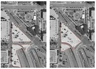Comparison of the memorial's original site (left) and the site after modification by P.L. 109–396, which truncated the southern portion of the proposed grounds.