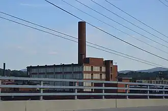 An option was placed on the American Viscose site in 1959 by Union Carbide, but that company ultimately backed out.[3] In 1961, American Viscose auctioned off its remaining equipment and a consortium of Roanoke investors purchased the property.[3] The site was subdivided and turned into the Roanoke Industrial Center, the city's second industrial park, and as of June 2023 the complex had 120 tenants.[13] Sixteen of the original buildings still stand, many with little alteration.[3] As a precautionary measure against eventual decay, the factory's original smokestacks, once standing 300 feet (91 m) tall, were pared down in 2001.[14] Bricks were removed from the top and gradually dropped inside the hollow chimneys until the level of debris inside reached the level of the walls.[14]