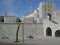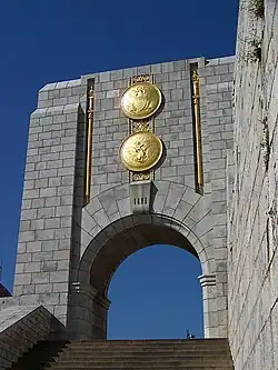 The American War Memorial (pictured at right) is a World War I naval monument located near the north end of Line Wall Road in the British Overseas Territory of Gibraltar, at the southern end of the Iberian Peninsula.[1][2][3] More formally known as the Naval Monument at Gibraltar, the memorial and steps were incorporated into the Line Wall Curtain at Prince Albert's Front giving pedestrians access to the lower Reclamation Road, Fish Market Lane, and Queensway.[3][4] The steps connected the town above with the Royal Navy facilities below.[4] The monument was designed by architect Paul Philippe Cret (1876–1945), a native of France who was a professor at the University of Pennsylvania. Cret (pictured at right) designed the memorial on behalf of the American Battle Monuments Commission. It was constructed between 1932 and 1933.[3][5][6][7] The inscription (link below) over the arch of the memorial indicates that it was "erected by the United States of America to commemorate the achievements and comradeship of the American and British Navies in this vicinity during the World War."[8][9] On the other side of the masonry arch are two bronze medallions (pictured below) depicting the seals of the United States and of its Department of the Navy. The dolomitic limestone utilised in the construction of the monument came from the Rock of Gibraltar.[4] The memorial is an example of the successful incorporation of a relatively recent work into older, existing architecture.[6]