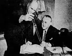 The relationship between Stokowski and Toscanini had in earlier years been mutually cordial, but turned tense after a two-week exchange of podiums in 1930 when they were respectively the music directors of the Philadelphia Orchestra and the New York Philharmonic-Symphony Orchestra.[61] Shortly before the exchange, Stokowski had written admiringly of Toscanini, saying that he had been "moved with the beauty and magnificence" of his conducting. The latter did not reciprocate the gesture; instead he called his colleague a "charlatan".[62] Their approaches to music, performance, and programming were highly divergent.[63] Toscanini complained to David Sarnoff, founder and president of NBC, that Stokowski was "ruining" the NBC Symphony Orchestra with his seating arrangements and use of free bowing.[55] In October 1941, Toscanini drafted, but never sent, a letter to Stokowski wherein he rebuked his "brutal, bestial, ignobil [sic], unmusical performance" of César Franck's Symphony in D minor, and for being a "ganster [sic] like Hitler and Mussolini".[64] Oliver Daniel described Toscanini as being "obsessed" with Stokowski and that he behaved with him "like a medieval Tuscan pursuing a vendetta".[65]